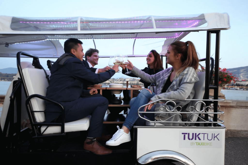 eTukTuk : 12 personnes max / groupe – Réhausseurs fournis aux enfants de + 5 ans (sur demande) – Sièges 1-2-3 fournis aux enfants de + 9 kg (sur demande)